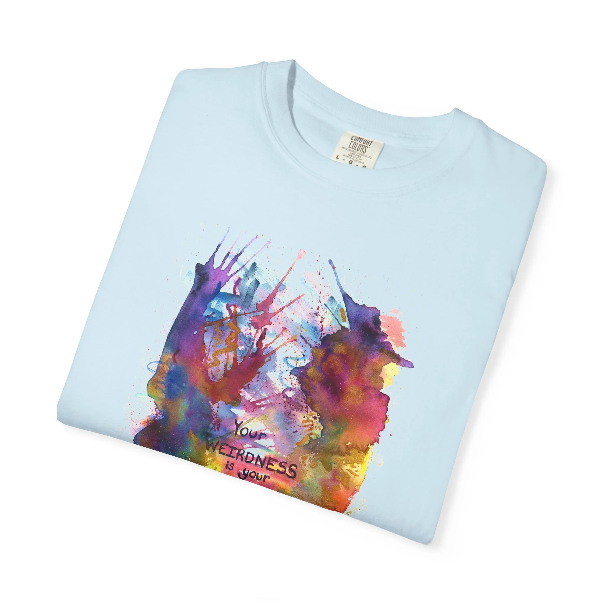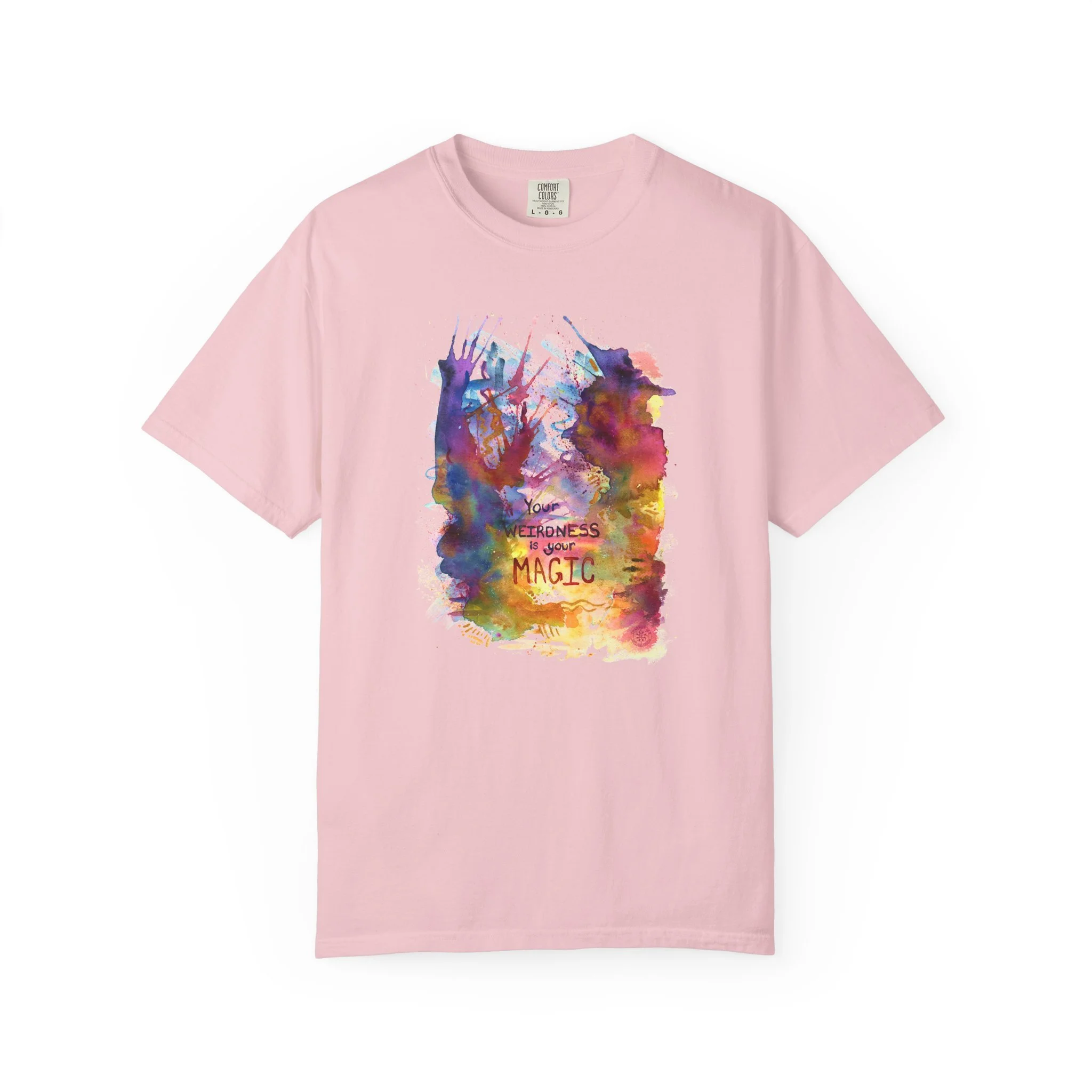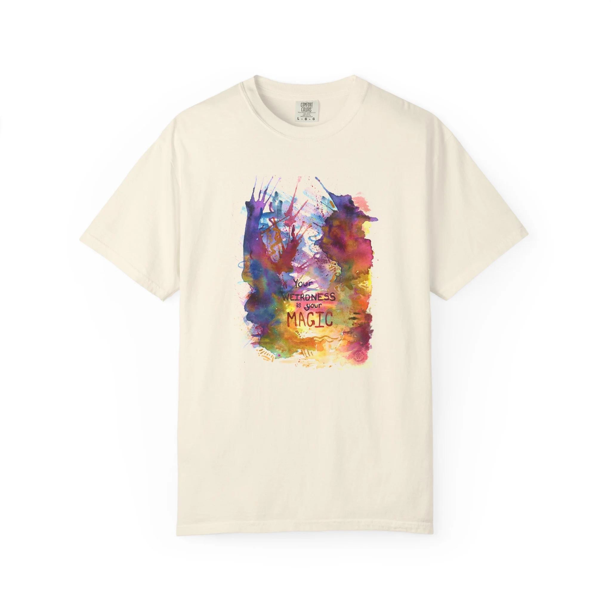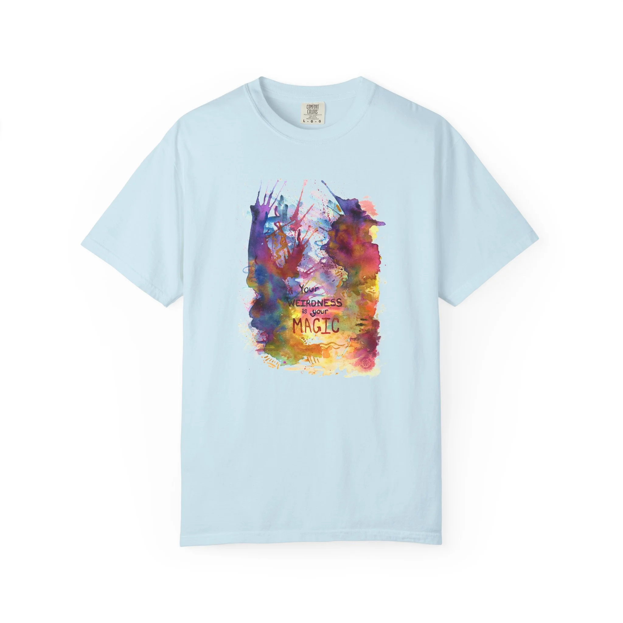 Embrace the beautiful weirdness that makes you magic with this t-shirt featuring orignal watercolor artwork. Text on shirt reads "Your weirdness is your magic."